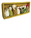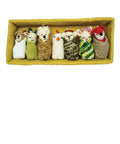 Our Woolly Wee Ones contains seven wee baby animals wrapped in their blankets. Each animal has a string for hanging on the tree. This set comes with a felted basket to contain them in.