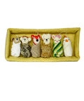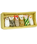 Our Woolly Wee Ones contains six wee baby animals wrapped in their blankets. Each animal has a string for hanging on the tree. This set comes with a felted basket to contain them in.